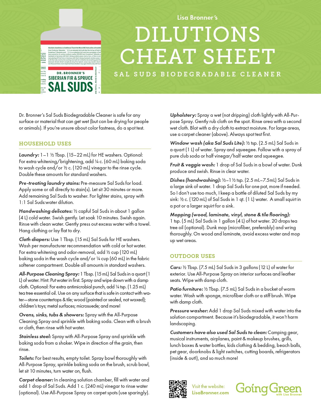 Sal Suds Dilutions Cheat Sheet Sal Suds cleaner shows >60% biodegradation after 28 days per ISO 14593.